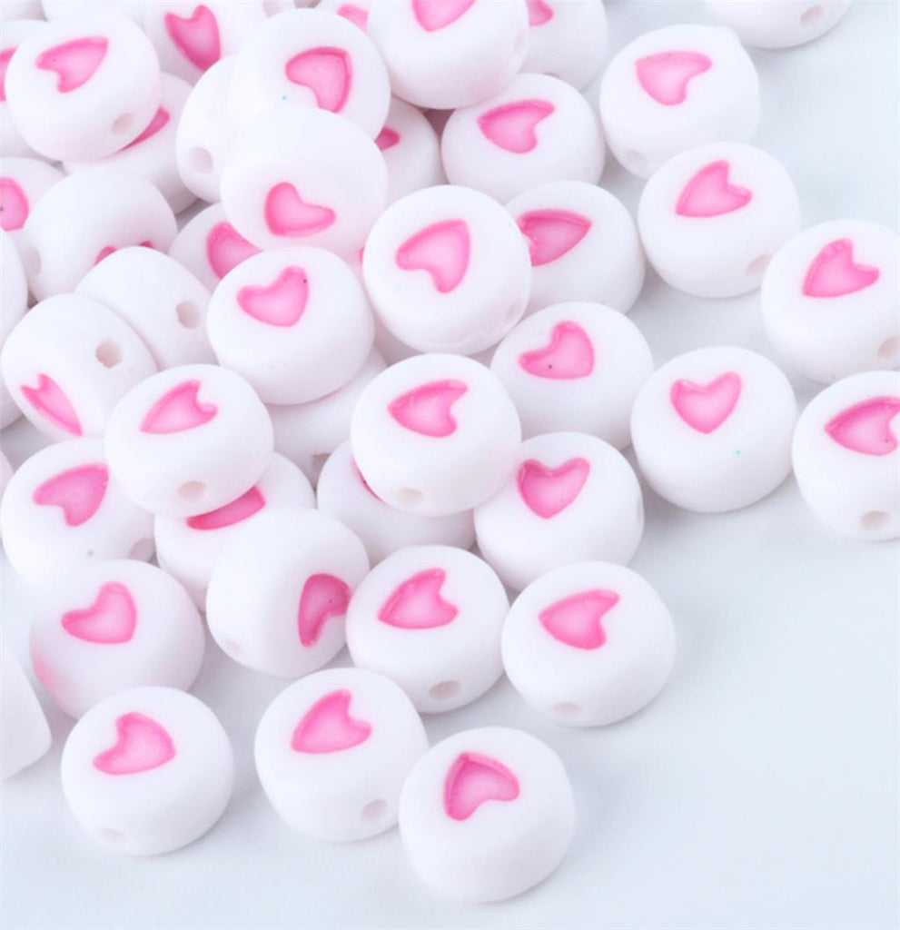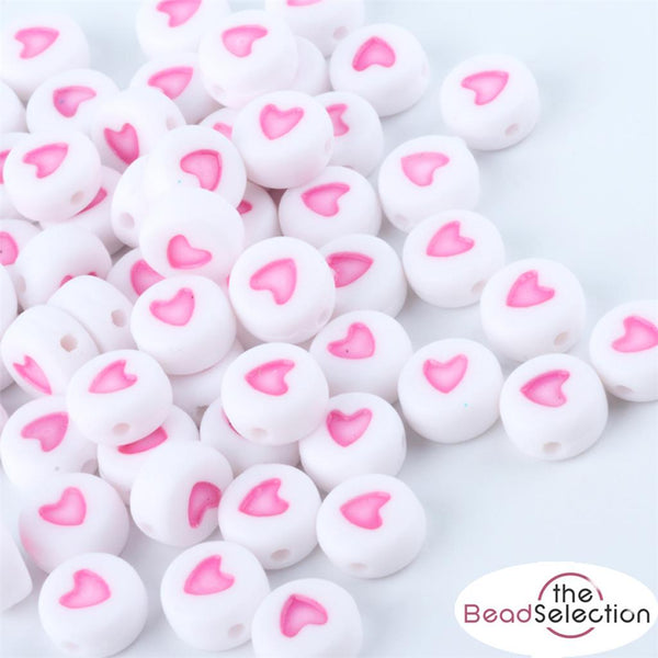100 White Round Pink Heart Beads Acrylic 7mm Jewellery Making Childrens ACR221