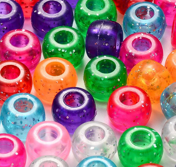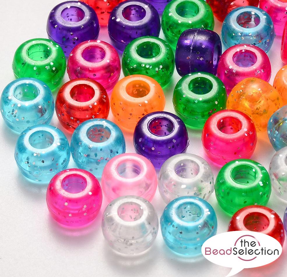 200 GLITTER ACRYLIC BARREL PONY BEADS 9mm x 6mm LARGE 3.5mm HOLE MIXED ACR209